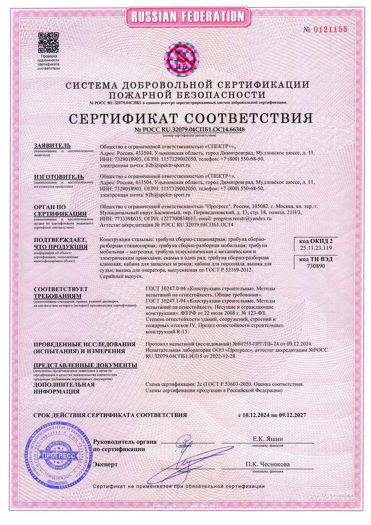 Сертификат соответствия (пожарный на трибуны)